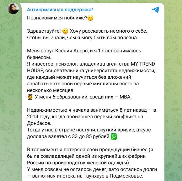 Зато у Аверс есть телеграмм-канал «Антикризисная поддержка», в котором Ксения рассказывает о том, как стала риэлтором, о проведении мастер-классов по инвестициям в дома и квартиры. Девушка приглашает посетить бесплатный демо-урок, а затем купить онлайн-занятия. Автор не называет стоимость курсов, но предлагает перейти в закрытую группу в Телеграмме. В нем она расскажет о цене и даст информацию по модулям, которые нужно будет изучить пользователям.