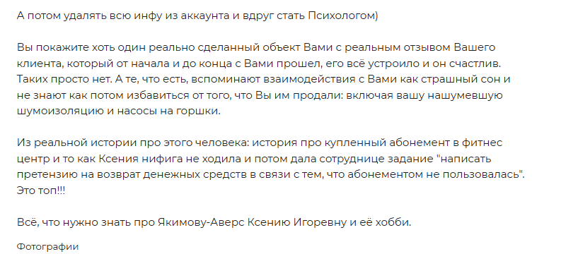Есть люди, отзывающиеся о наставнице в отрицательном ключе. Один из учеников в негативном отзыве о Ксении Аверса и курсах по недвижимости указывает на отсутствие настоящих доказательств об успешном обучении пользователей.