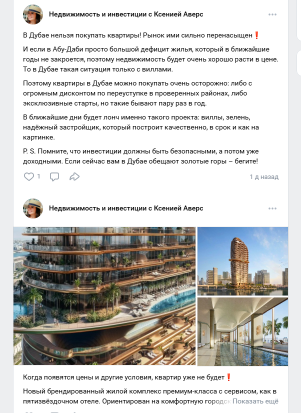 В ВК-группе с названием «Недвижимость и инвестиции с Ксенией» автор регулярно публикует посты о том, в каких странах нельзя покупать квартиры, так как рынок переоценен. Она также продает таунхаусы и прочие дома на островах с большим количеством туристов.