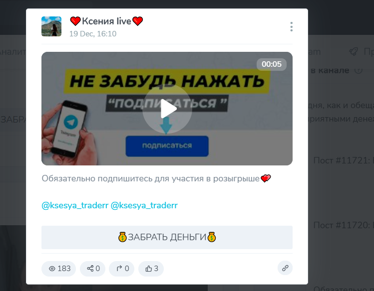 Если посмотреть на содержание канала, становится очевидно, что трейдинг не является его целью. Реальных торговых разборов, прозрачной статистики сделок, входов, выходов, стопов или анализа рисков нет. Вместо этого основной упор делается на мотивационные рассуждения, личные истории и, самое главное, на постоянные денежные розыгрыши.