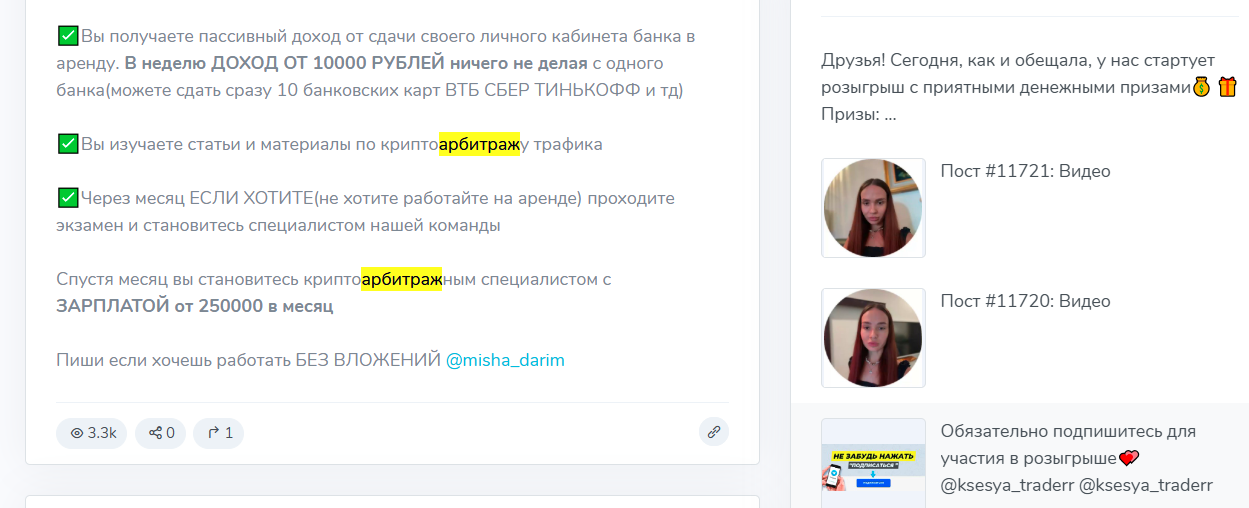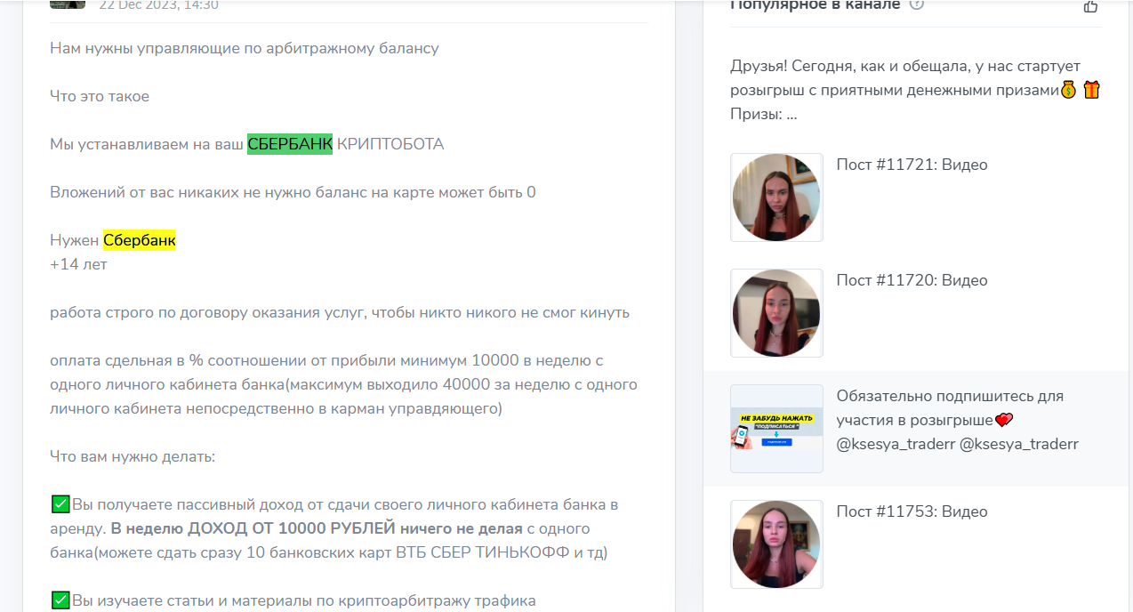 Помимо розыгрышей, на канале встречаются предложения поучаствовать в так называемом арбитраже. То есть дать свою банковскую карту или личный кабинет банка “в работу”, установить какие-то крипто-боты на карты Сбербанка и при этом якобы получать от 10К рублей в неделю без вложений.