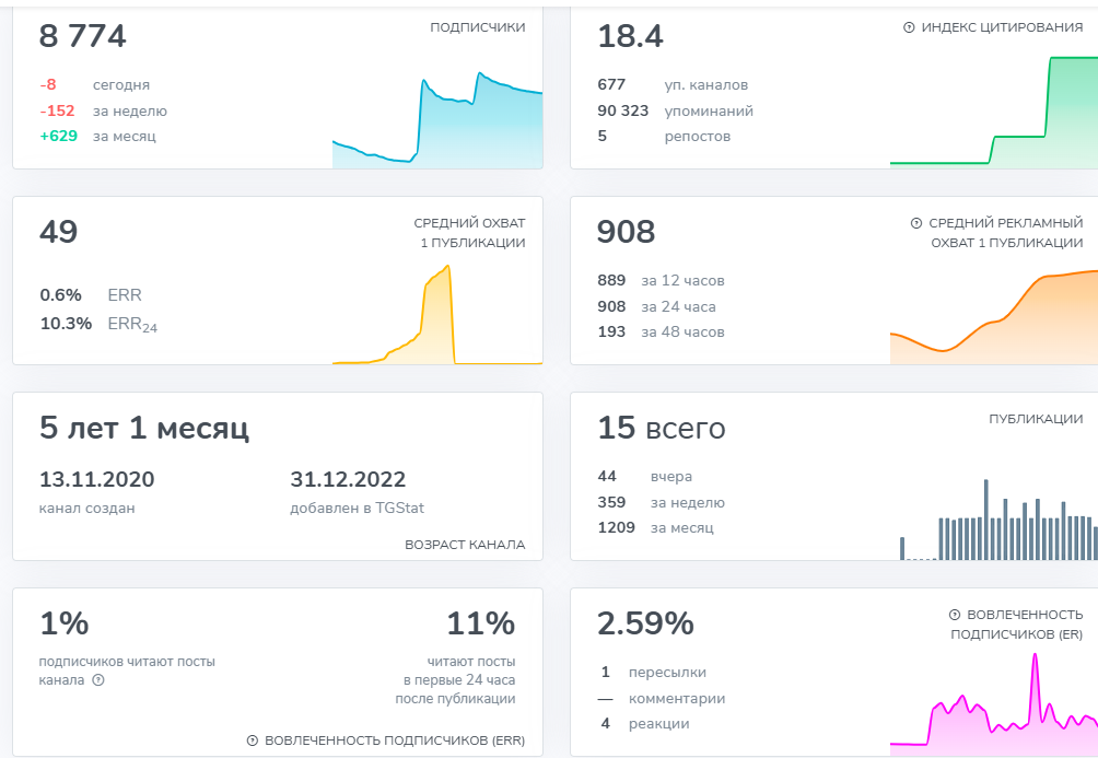 На момент анализа 19 декабря 2025 г. на канале около 8,7 тысячи подписчиков, при этом динамика не выглядит успешной. В среднем посты читают около 1% подписчиков, а вовлеченность ERR на уровне 2–3%, что для якобы экспертного трейдерского блога является очень слабым показателем.