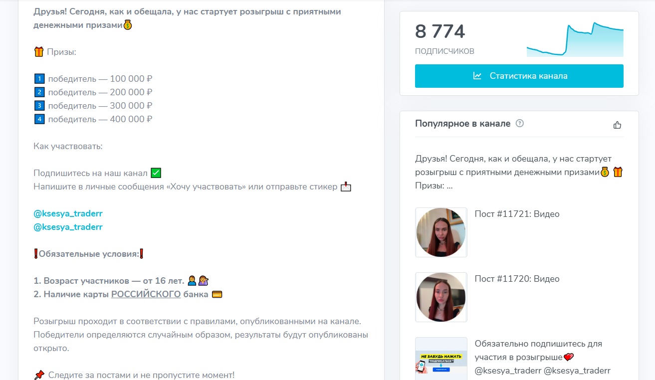 Розыгрыши это центральная механика проекта. Практически каждый активный период в канале сопровождается обещаниями выплат от 100К до 400К рублей, призывами срочно писать в личные сообщения и демонстрацией якобы победителей. Пользователей подталкивают к личному контакту, где и начинается основное взаимодействие.
