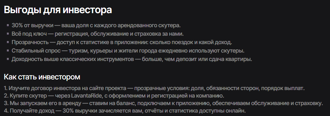 Lavanta Ride обещает 100% годовых на скутерах, но без отзывов и с размытыми условиями — звучит как билет в один конец к финансовым потерям.