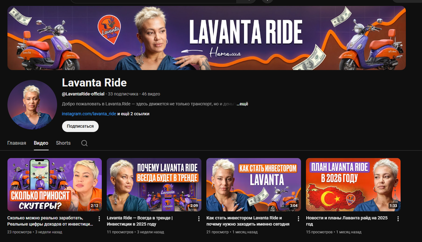 Примечательно, что Телеграм-канал вообще не указан на сайте, он ведется только на русском, хотя, по идее, ЦА проекта проживает в Турции. Есть еще Ютуб-канал, на котором рекламируется инвестиционное предложение, а также отзывы тех, кто инвестировал в Lavanta Ride. Канал тоже не пользуется особой популярностью.