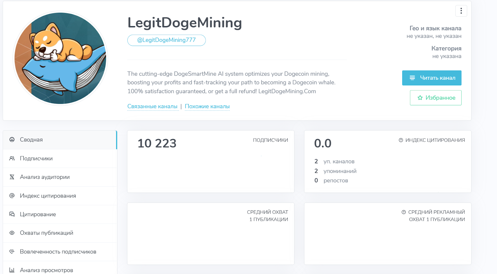 Telegram-канал LegitDogeMining777 насчитывает 10223 подписчика. Сообщество было создано 24 ноября 2023 года. За это время в канале было опубликовано 39 постов, что является низкой активностью для платформы. Последняя публикация датируется 233 дня назад. Средний охват одной публикации составляет 10500-22900 просмотров. Индекс цитирования канала равен 0, а показатель вовлеченности подписчиков не отображается из-за недостатка данных. Группа помечена как scam с предупреждением о мошенничестве. Это подтверждается отзывами, где пользователи жалуются на проблемы с выводом средств и блокировкой аккаунтов.
