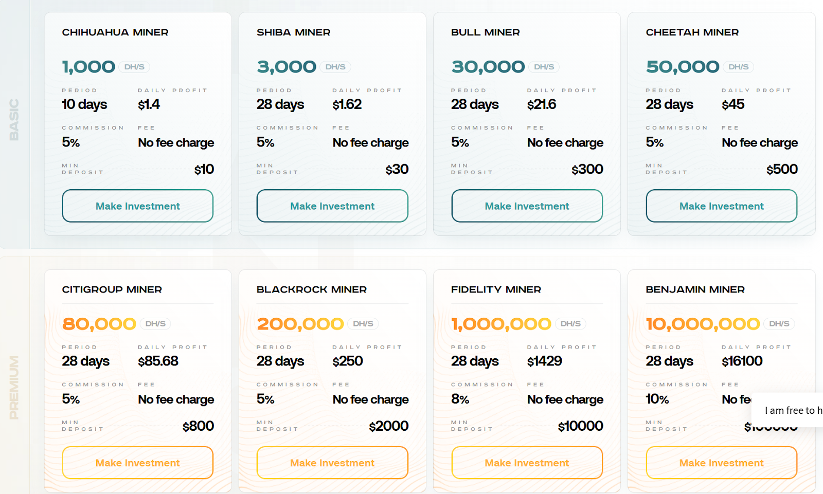 Премиум-категория ориентирована на пользователей, которые готовы вкладывать большие суммы. Первый премиум-план начинается с депозита в 800 долларов и действует 28 дней. Он обещает около 85.7 долларов ежедневной прибыли при той же комиссии. Хэшрейт указан как 80.000 Dh/s. Следующий уровень требует 2000 долларов депозита и также длится 28 дней с ежедневной прибылью в 250 долларов. Хэшрейт заявлен как 200.000 Dh/s.