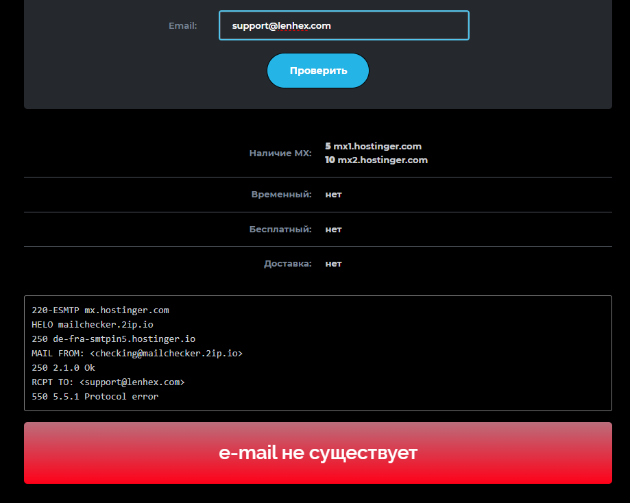 Зато проверка email службы поддержки support lenhex com позволяет узнать, что его решили даже не создавать: