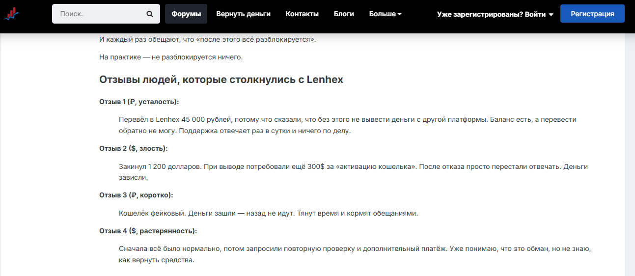 Нельзя узнать информацию о тарифах, комиссиях, о том, сколько lenhex com выводит деньги.