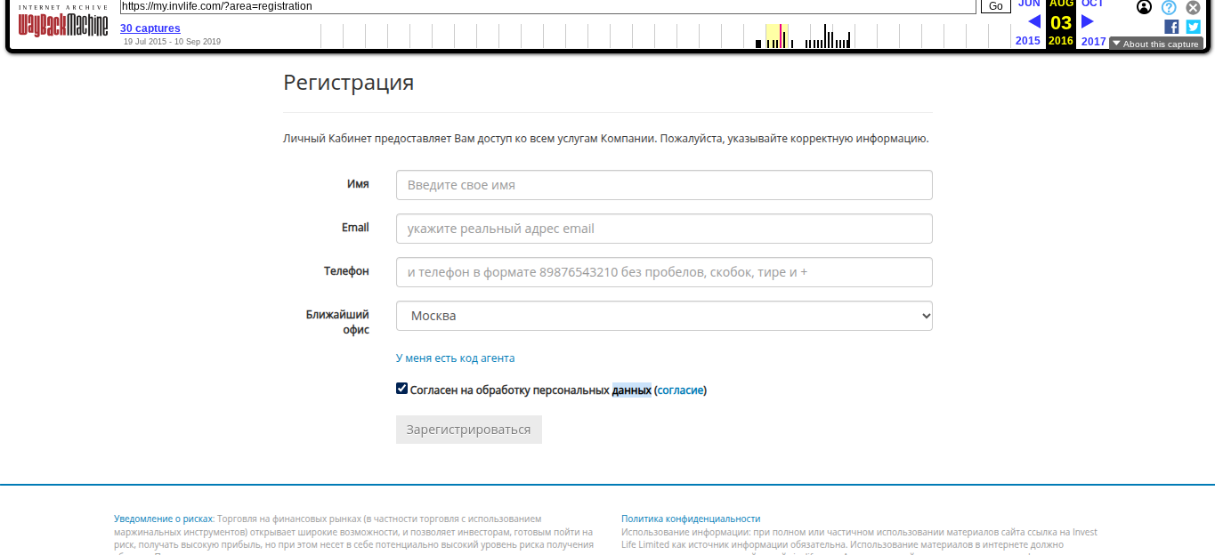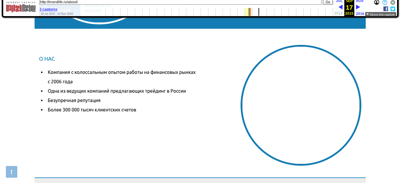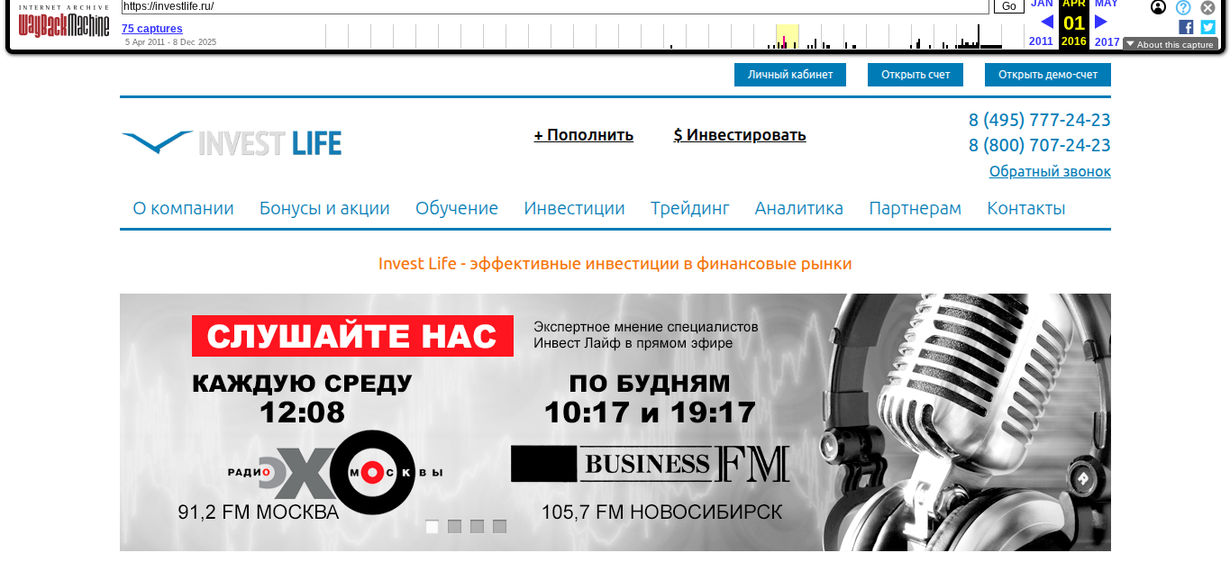 Для сбора информации по бирже мы использовали аналитический инструмент WebArchive. Из него мы узнали, что у брокера Life Invest Limited были 75 копий, нон открыть получилось только резерв за 2016.