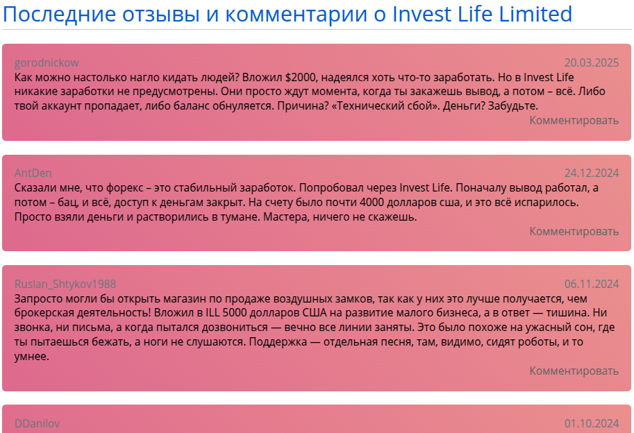 В сети есть множество негативных отзывов о брокере Life Invest Limited. Бывшие пользователи пишут, что биржа не выводит деньги, а все ее обещания — вранье для прогрева клиентов. Никаких успешных сделок у брокера нет.