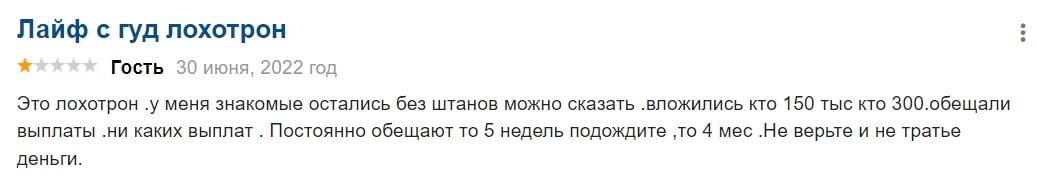 Сейчас, когда тысячи вкладчиков кинуты на деньги, читать подобное было бы смешно, если бы не было столь грустно. Теперь таких отзывов о Лайф из Гуд, конечно, уже нет: заказные писать некому, а те, кто был очарован выплатами, рыдают над потерянными деньгами.