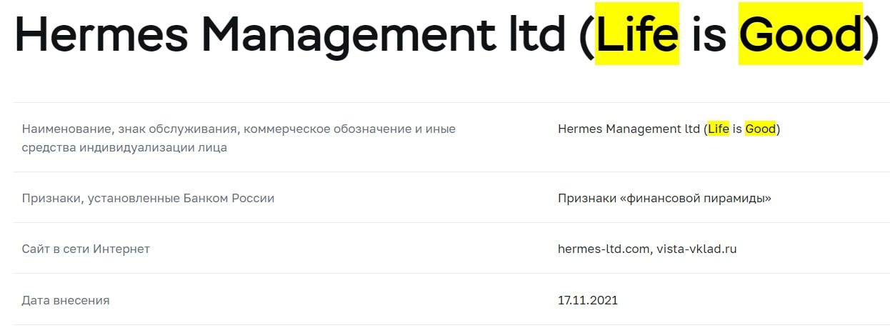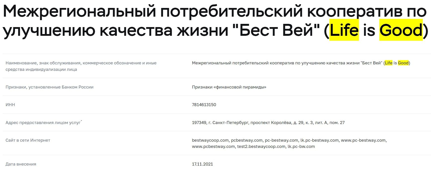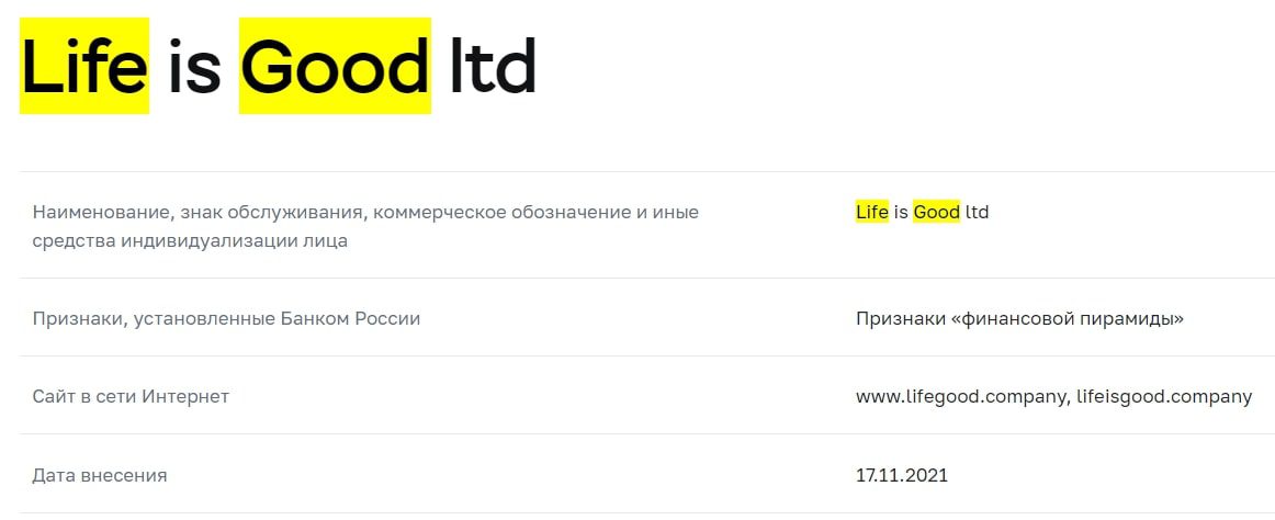 Деятельность была рассчитана, в частности, на страны СНГ. Пирамида Life is Good – хороший пример того, что в любом проекте важно трезво оценивать возможности той компании, куда вкладываются деньги. Платформа для вложений существовала довольно долго, её успели публично и громко похвалить многие известные личности. Она была официально зарегистрирована… Всё до поры до времени. Сейчас записи о ней на сайте Центробанка РФ выглядят вот так: