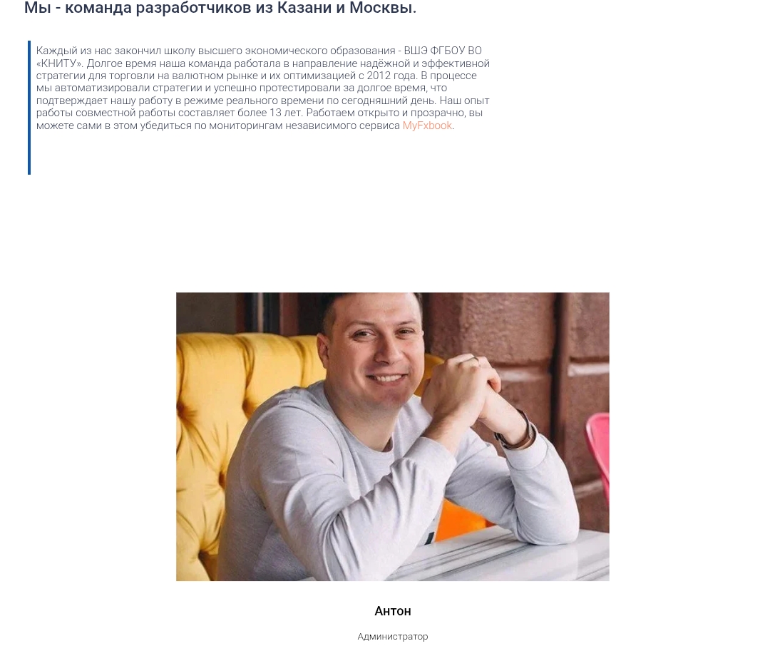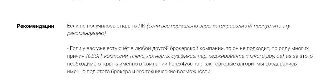 - Для подключения нужна обязательная регистрация у брокера Forex4you по партнерской ссылке, из этого следует, что проект зарабатывает на комиссии, а прибыль клиента может оказаться не приоритетной.