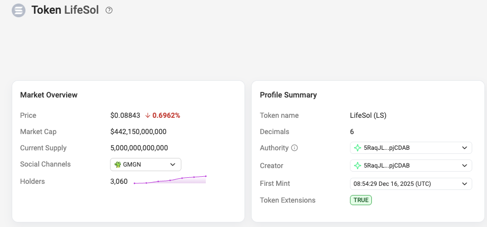 Токен можно найти СОЛ скан. Судя по информации, которую там можно найти, минт токена произошел 16 декабря 2025 года.