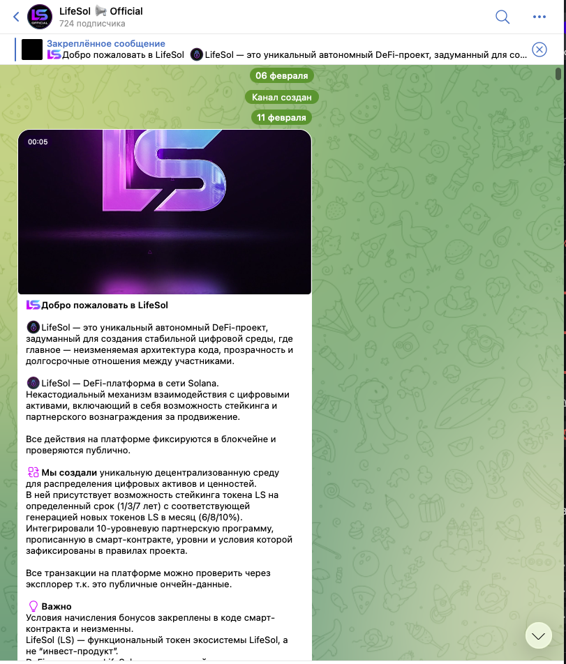 В первой же публикации видны основные тезисы по проекту, которые позволяют сделать вывод о том, что DEX токены LifeSol – лохотрон. Пользователям предлагают зарабатывать на высокодоходном стейкинге от 6 до 10% в месяц (в криптовалюте Лайф Сол), а также сразу 10-уровневую партнерку. Это уже говорит о том, что принцип работы проекта имеет признаки финансовой пирамиды. Только в этом случае о реальной доходности речи не идет. Дело в том, что если даже застейкать определенную сумму монет на 7 лет и получать максимальную прибыль в 10% ежемесячно, то она даже не сможет перекрыть падение курса. Например, за последний месяц токен обесценился почти в 3 раза: