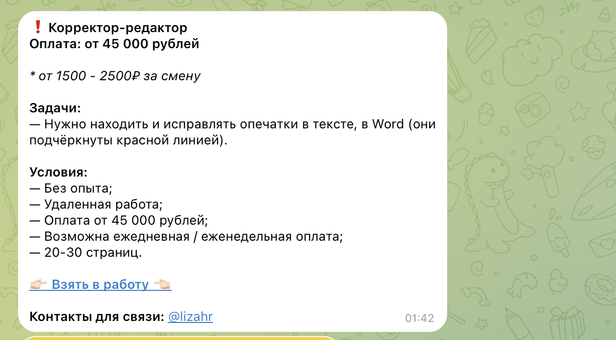 Отдельные предложения перенаправляют пользователей в закрытые чаты после оплаты. Отсутствие прозрачных условий возврата средств и официальных реквизитов увеличивает риски. Вакансии иногда публикуются вместе с реферальными ссылками. Это указывает на заинтересованность канала в привлечении регистраций, а не только в трудоустройстве подписчиков.
