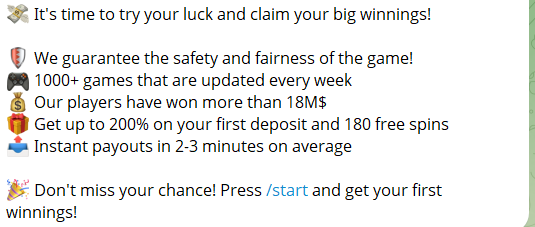На канале телеграмм-бота Link Gaming говорится, что участники могут испытать удачу и получит большие выигрыши. Доступно более 1000 различных азартных игр и они обновляются каждую неделю. Якобы игроки смогли выиграть в казино-боте более чем $18,000,000, как сообщают создатели. К первому депозиту, который пополнит игрок, обещают бонус в 200%, а также в подарок участник получит 180 фри-спинов в казино-боте.