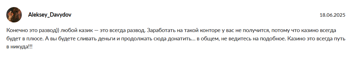 - В отзывах люди говорят о том, что это мошеннический проект и в казино-боте можно лишь потерять деньги, следовательно, впечатление о нем у людей негативное.