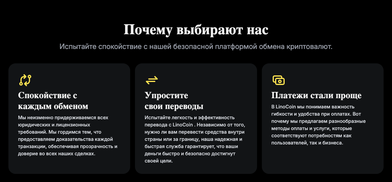 «Лино Коин» — криптовалютный обменник, который появился лишь в начале 2026 года. Его владельцы предлагают услуги по свопу около 20 видов цифровых активов.