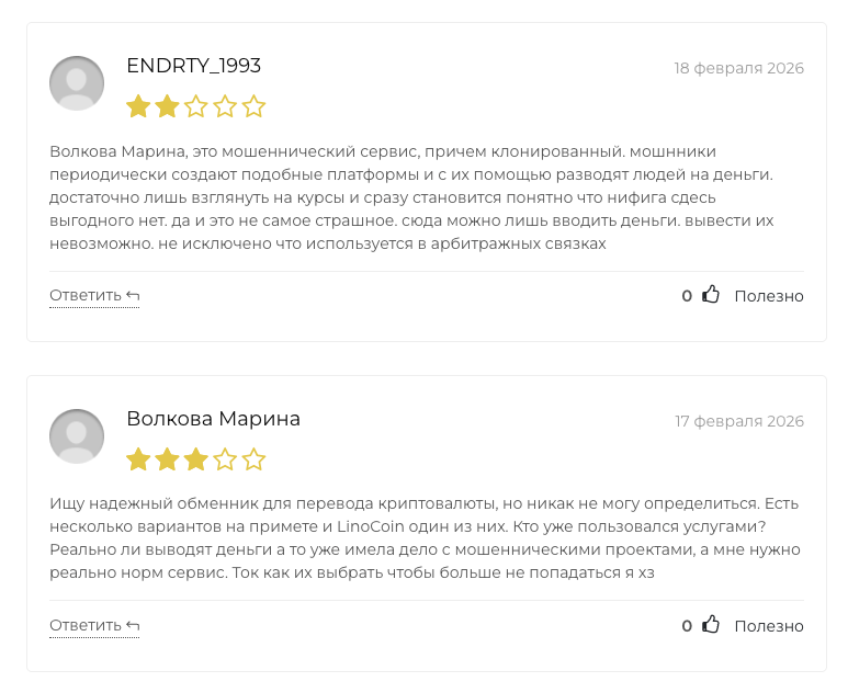 Автор одного из отзывов об обменнике https linocoin com пишет, что данный сервис однозначно является мошенническим. По его словам, отправленные по реквизитам эксчейнджера деньги затем невозможно вернуть.