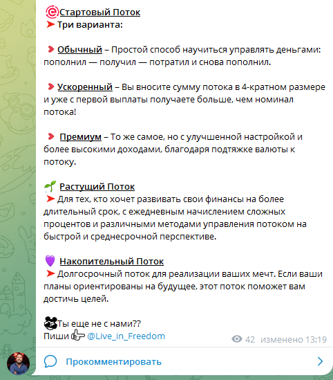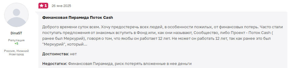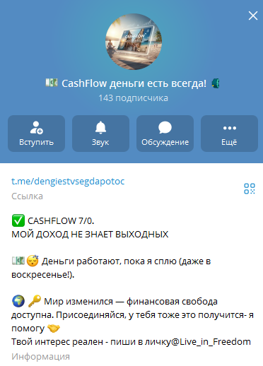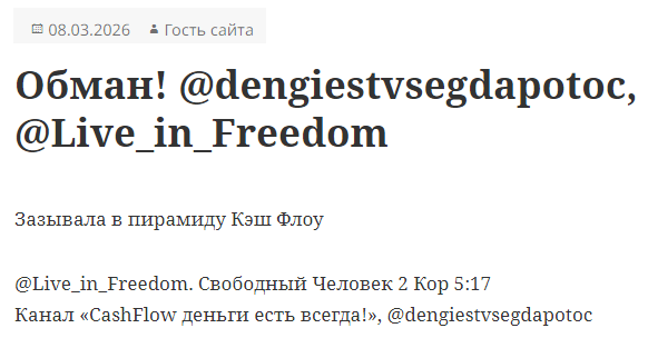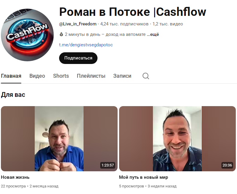 Автор канала «Роман в потоке» вводит людей в заблуждение и не демонстрирует подтверждений того, что участники проекта богатеют и выводят прибыль с платформы. Юзер с ником «Лайв Ин Фридом» является частью команды аферистов, разводящих граждан на внесение финансовых средств в пирамиду «КэшФлоу». В тг-сообществе «ДенгиЕстВсегдаПоток» доказательства увеличения дохода участников отсутствуют.