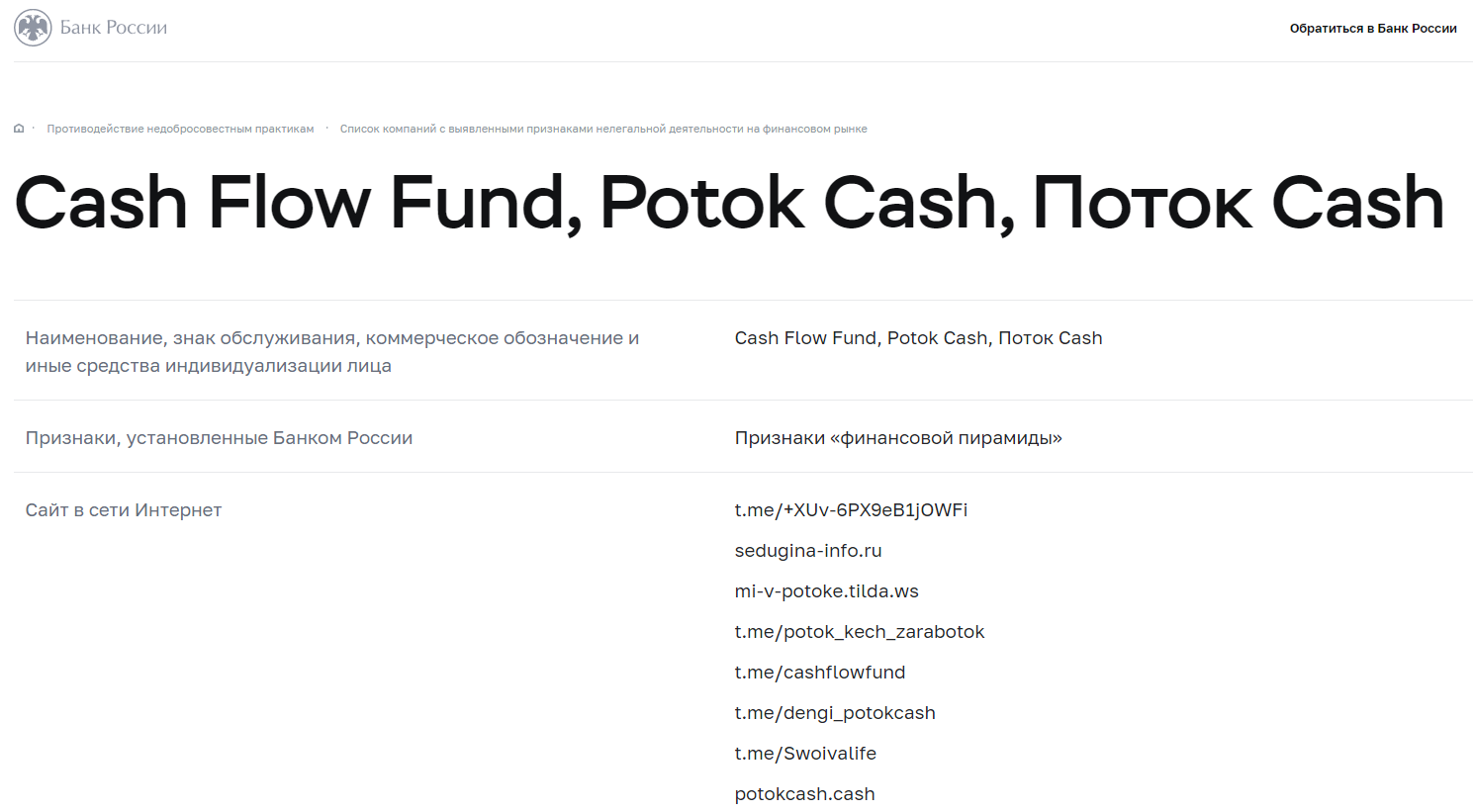 - площадка «Кеш Флоу» классифицируется Центральным Российским Банком как сервис аферистов;