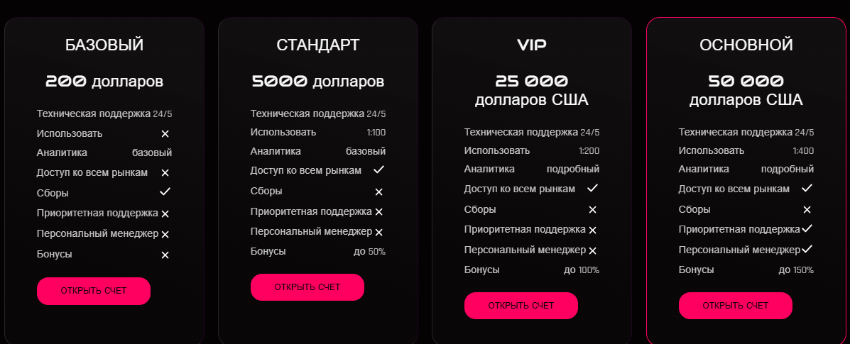 - на бирже Oradlx net презентуются четыре типа счета: с минималкой от 200 долларов для базового тарифа и от 50 000 долларов для варианта Prime;
