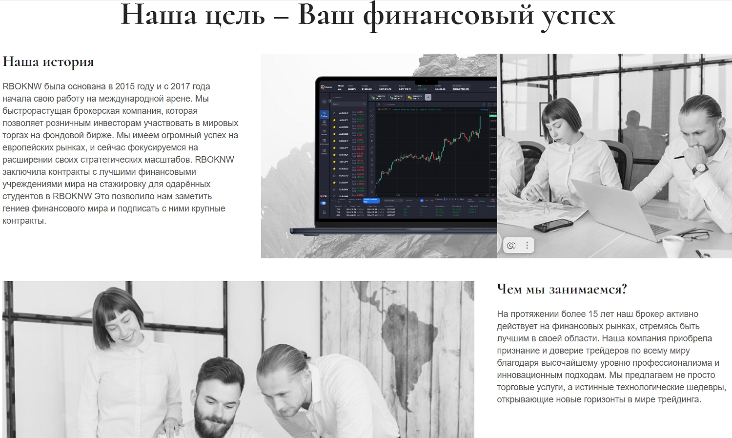 Создатели Rboknw пишут о десятилетнем опыте в трейдинге, однако сайт конторы обновили лишь 01.08.2025. Регистрация домена оформлена до 29.05.2026, что требует повышенной бдительности инвесторов.