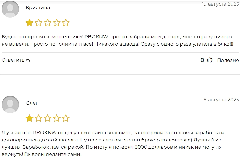Это не брокер, это мошенник! Трейдеры из Rboknw обещали мне стабильный доход при условии сотрудничества, я повёлся как дурак, перевёл им свои деньги, а они просто потом меня заигнорил и заблокировали. А я думал, что сейчас буду делать с ними золотые горы… Ага, нифига! Не ведитесь на этих скаммеров и ни в коем случае не верьте их словам!