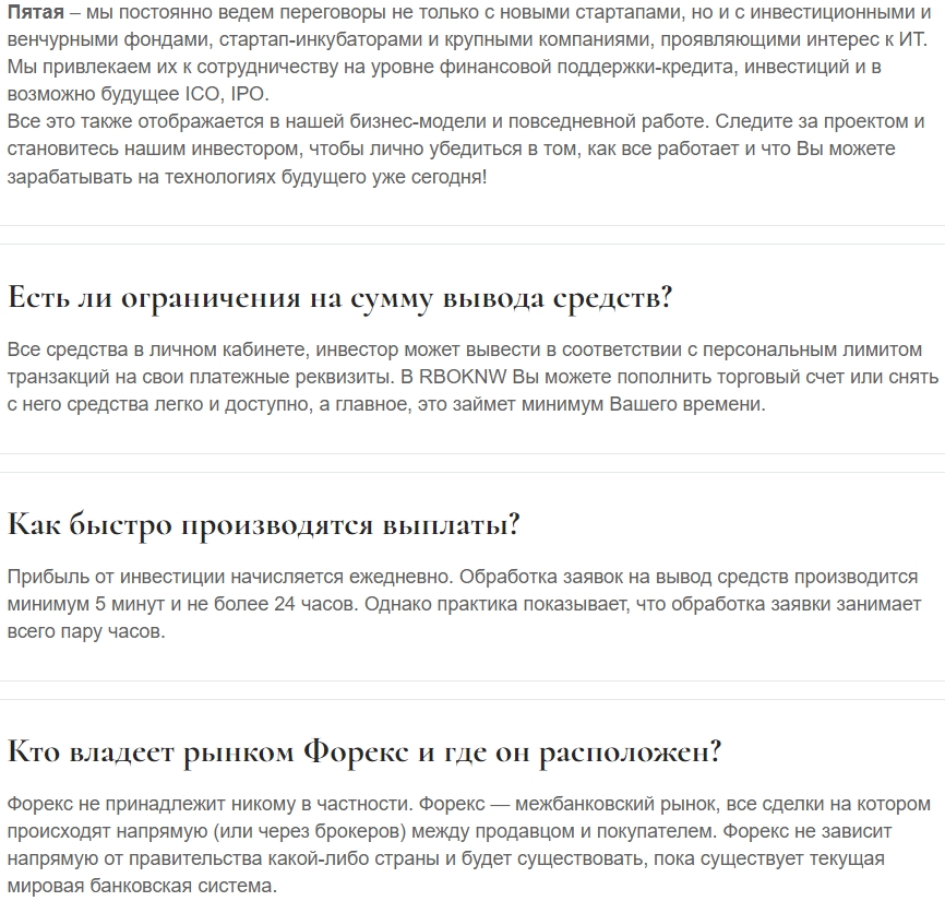 Есть крупный риск потерять деньги сразу после пополнения кошелька «Рбокнв», а информация в составленном на скорую руку Eula только подтверждает это. На Rboknw com пишут о выплатах в течение пары часов, правда в клиентском соглашении указаны совсем иные сроки.