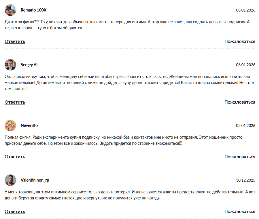 Этот так называемый «бот» для знакомств — просто очередная ловушка для наивных пользователей. Завышенные цены на сообщения, фейковые профили и полное отсутствие поддержки — классический развод. Не тратьте время и деньги на этот мусор.