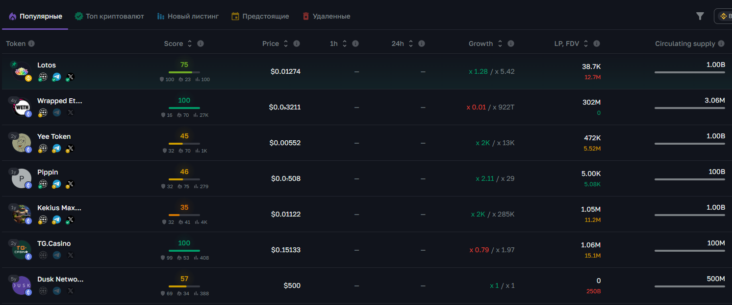Новые токены появляются на платформе буквально каждый день. С помощью Lotos Io пользователи первыми могут вложиться в коины, а также изучить всю информацию о них.