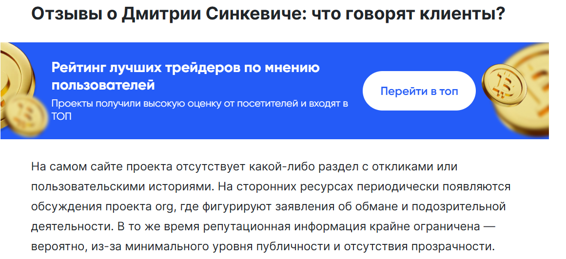 Отсутствие отзывов само по себе является проблемой. Автор, который представляется как Дмитрий Синкевич, анонимен. Проект не зарегистрирован в базах данных финансовых органов и не имеет лицензий на предоставление инвестиционных услуг.