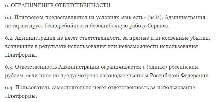 В информационной карточке проекта LuckyTonRobot закреплена ссылка на пользовательское соглашение. Ознакомившись с документацией, мы выяснили, что организаторы криптовалютного сервиса не спешат брать на себя ответственность за финансовые убытки, которые могут ожидать публику на площадке.