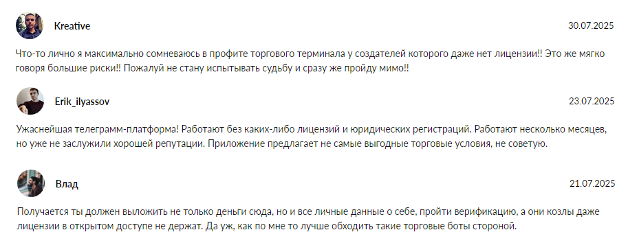 - разработчики финансового терминала не обладают лицензией и тщательно скрывают достоверные данные о тг-платформе;
