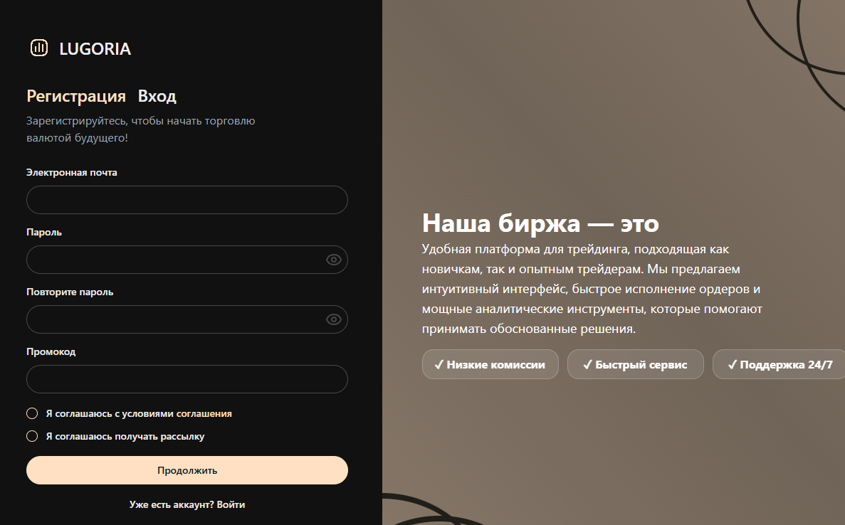 Lugoria позиционирует себя как инновационная криптобиржа с низкими комиссиями и быстрым исполнением ордеров, но отсутствие лицензии, скрытые тарифы и минимальная информация о проекте вызывают серьезные сомнения в ее надежности.