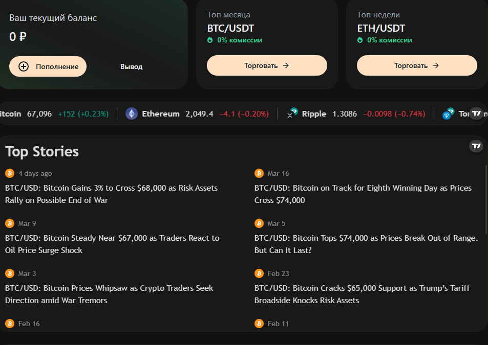 На сайте биржи есть новостной раздел. В нем опубликованы краткие сообщения о движении крипты. В основном контент посвящен динамике цены биткоина и общей ситуации на крипторынке. Часть новостей устарела. Они не обновляются в реальном времени.
