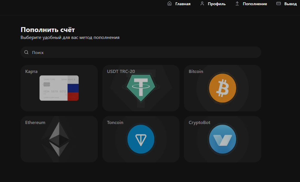 После входа в личный кабинет пользователям предлагается пополнить счет. Среди доступных способов депозита указаны: