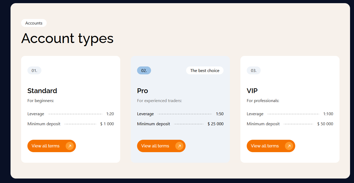 - Pro. Мин. депозит: $25,000. Максимальное плечо: 1:50.