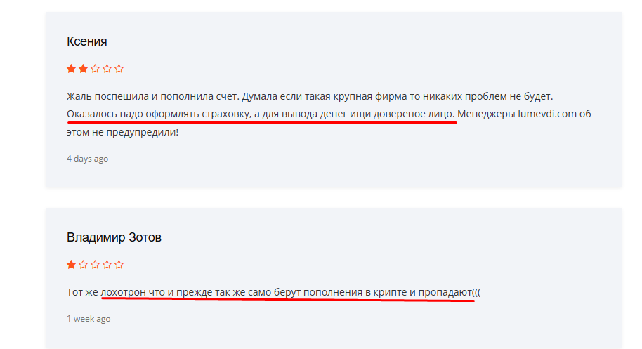 Если же поискать оставляемые в адрес lumevdi com отзывы на независимых сайтах, то там пользователи сообщают о явных проблемах.