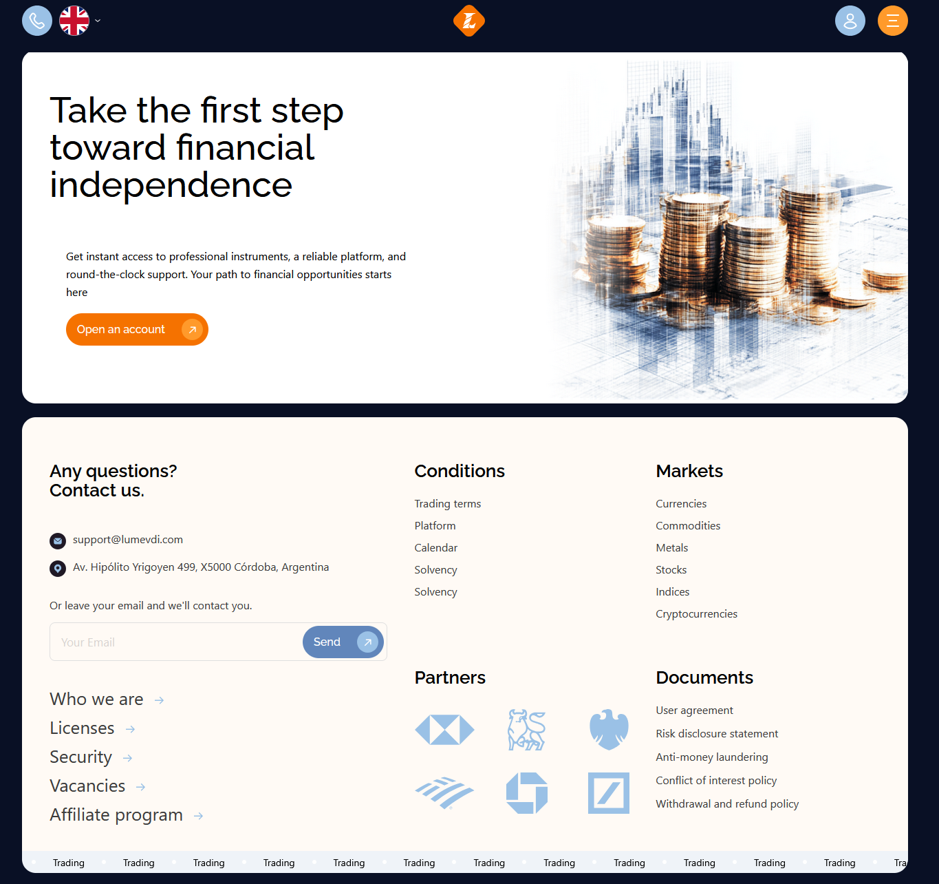 Брокер Lumevdi обещает каждому, кто откроет здесь счет, обеспечить доступ к валютному рынку, криптовалютам, акциям, индексам, сырью и металлам.