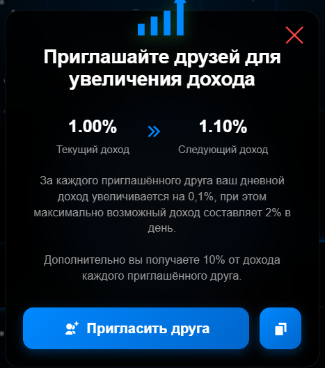 По умолчанию игрок Lunar Hash получает доход 1% в день, повысить его на 0.1% можно, пригласив друга. Таким образом, чтобы достичь максимального дохода 2%, необходимо пригласить 10 рефералов.