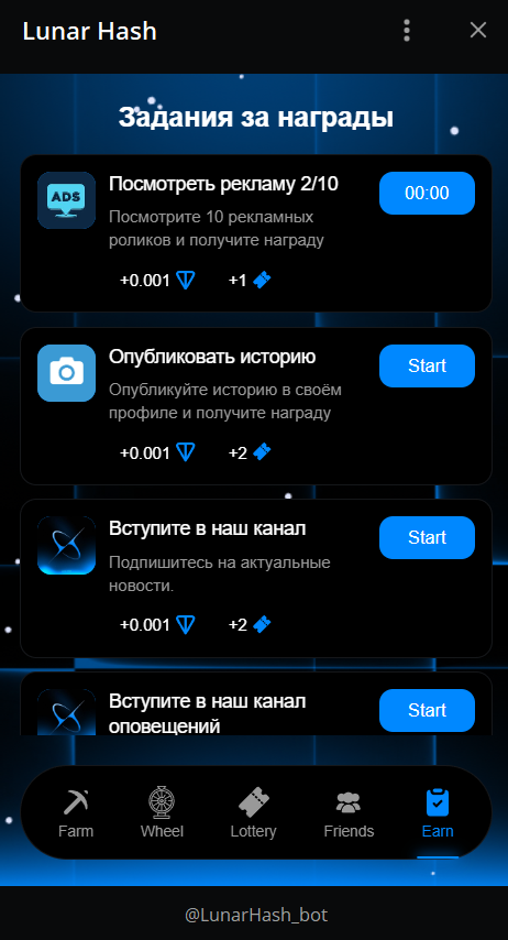 Игра запускается через @LunarHash_bot, в виде мини-приложения. На старте у игрока 0 монет TON, и их можно либо заработать либо внести. В разделе «Earn» есть задания, которые заключаются в получении приветственного бонуса, оформлении подписки на телеграм-канал, просмотре рекламных видео.