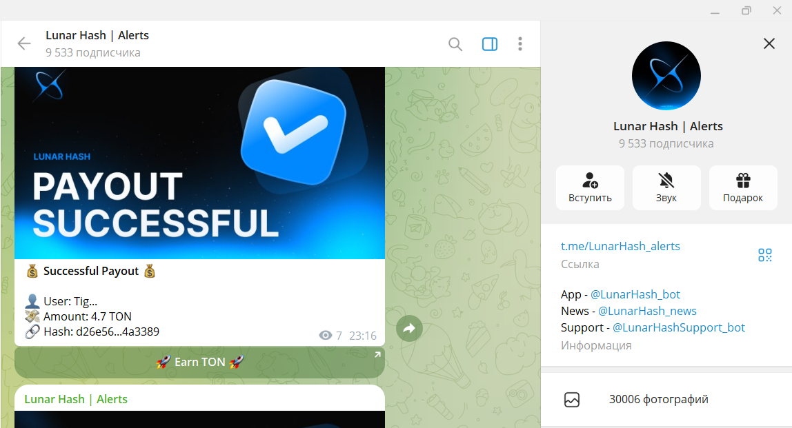 @LunarHashSupport_bot – аккаунт поддержки Lunar Hash Support. Указано время работы – с 8:00 до 22:00 UTC. @LunarHash_alerts – канал Lunar Hash Alerts, где публикуются отчеты о выводах и внесениях средств пользователей.