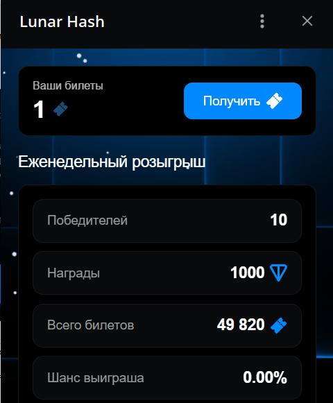 LunarHash – игра, запуск которой состоялся в декабре 2025 года в качестве мини-приложения для Telegram. Основная суть заключается в стейкинге TON за телеграмм-звезды. Игроку достаточно внести средства, после чего активировать как можно больше внутриигровых инструментов для бонуса роста, после чего вложения начинают накапливаться.