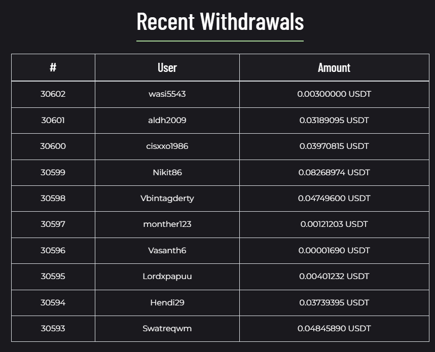 Согласно информации на сайте, вывод средств осуществляется в USDT через FaucetPay без минимального депозита. В статистике указано, что пользователям якобы выведено 7585 USDT, однако все демонстрируемые выплаты являются мизерными — от 0.00001 до 0.16 USDT.