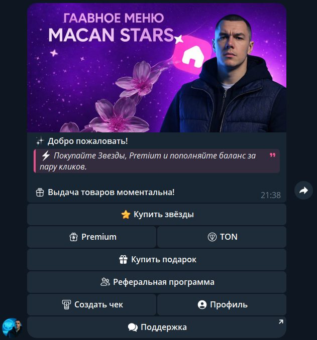 MACAN STARS — бот в Telegram для покупки Stars и NFT. Проект только использует имя известного артиста, но не имеет к нему никакого отношения. Пользователям предлагают хорошие цены и простые варианты покупки Stars и NFT.