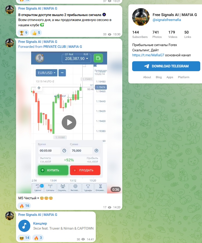 Проект также ведет канал Free Signals AI | MAFIA G, @signalsfreemafia предлагающий бесплатные торговые сигналы. Эти публикации позиционируются как «прибыльные сигналы», которые должны мотивировать подписчиков к дальнейшему участию в платном клубе автора.