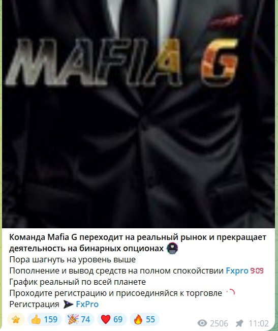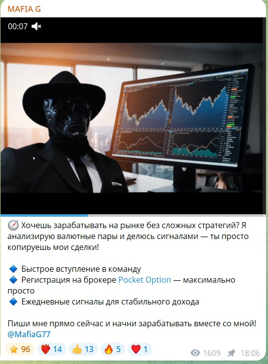 Тематика публикаций типична для подобных проектов. В канале размещаются рекламные призывы начать зарабатывать, скриншоты предполагаемых успешных сделок с бинарными опционами и инструкции по регистрации у партнерского брокера Pocket Option. Отдельный канал «Обучение Mafia G» позиционируется как площадка с пошаговым планом обучения скальпингу и дейтрейдингу.